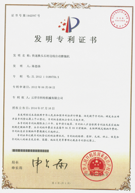 企業組建了“云浮市石材機械裝備工程技術研究開發(fā)中心”,并與高校和科研院所密切合作,致力于光機電一體化產品的研發(fā)、生產、銷售和服務。主要產品有框架鋸、全自動連續(xù)磨拋機、橋式自動切割機、全自動仿形石線機、數控金剛石繩鋸、裁切機等。產品具有自動化程度高、加工精度高和生產效率高等特點。產品除國內銷售外,還出口到歐美、東南亞、韓國、印度、中東、非洲、俄羅斯、澳大利亞等國家和地區,深受用戶好評!皹蚴阶詣忧懈顧C”被認定為廣東省高新技術產品,擁有發(fā)明專利1項、實用新型專利1項。
